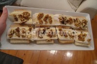 Comece tirando o miolo da morcela da tripa e untando as torradinhas com ela. O pão pode ser caseiro ...